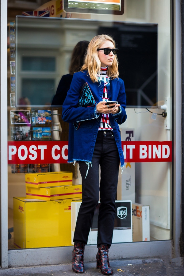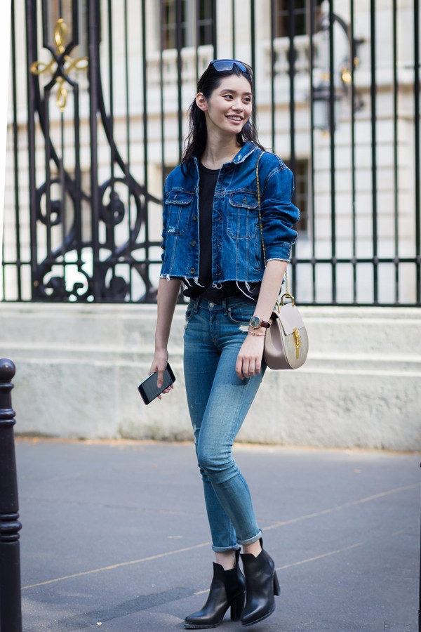 个性的牛仔外套搭配撞色打底衫非常前卫时髦,及踝靴让这种时髦得到进一步提升。