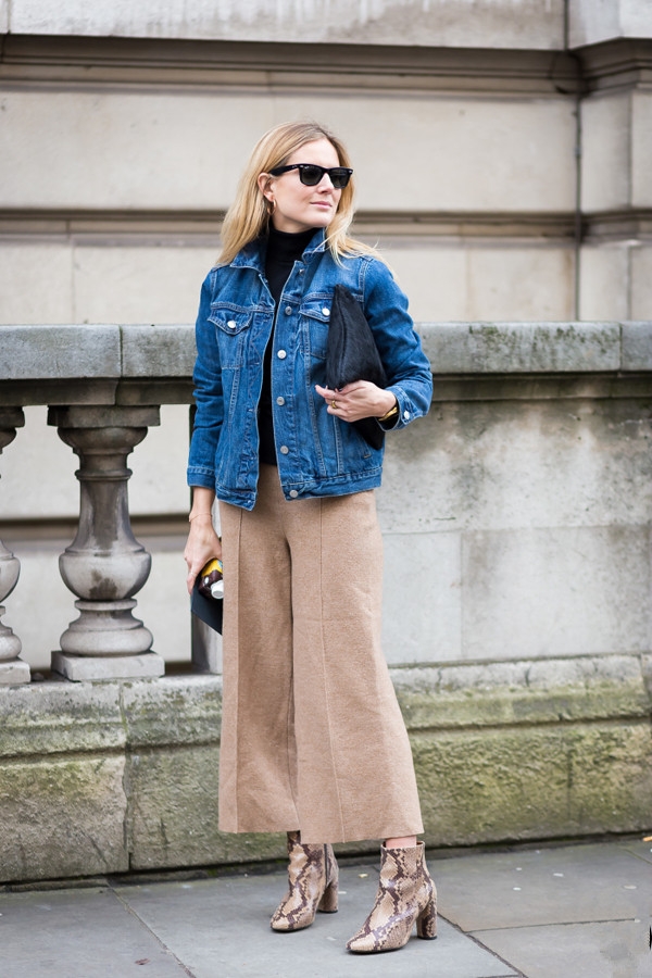 即使是和优雅的阔腿裤搭配也不会显得突兀,和裤子同色系动物纹路的及踝靴个性十足让造型有更多细节可看。