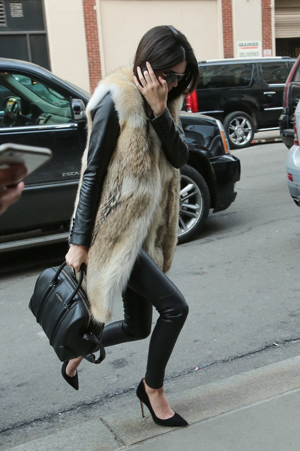 紧身裤的搭配使双腿曲线得到完美勾勒,和皮草外套硕大的廓型形成强烈对比让人看不透你的体型。