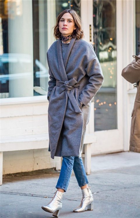 先来看看英国It girl Alexa Chung的灰色系带大衣搭配图片吧!这位姑娘可会穿衣了,灰色系带大衣搭配九分铅笔裤带来轻松感,银色的短靴时髦度杠杠的,印花细丝巾打造小细节,时尚精都特别会玩细节呢~