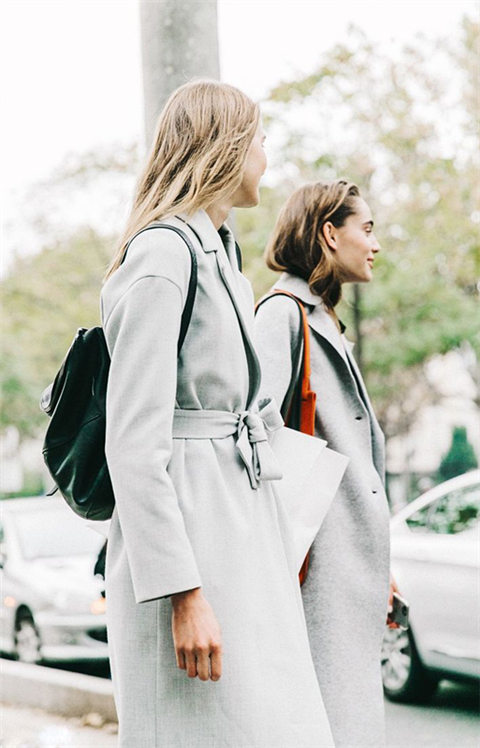 知性的浅灰灰色系带大衣非常需要气场,搭配迷你感的双肩包还真是少见,却带来意想不到的chic感~