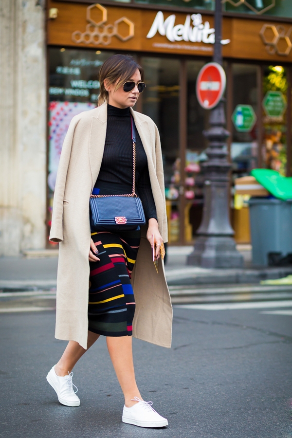 驼色呢子大衣搭配黑色打底衫与色块半裙,这种繁与简的搭配方式时髦极了。