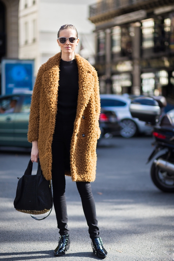 驼色的羊羔毛大衣外套具有体积感,因此容易显臃肿,内搭黑色收缩视觉感受,黑色与驼色亦是非常经典的组合。