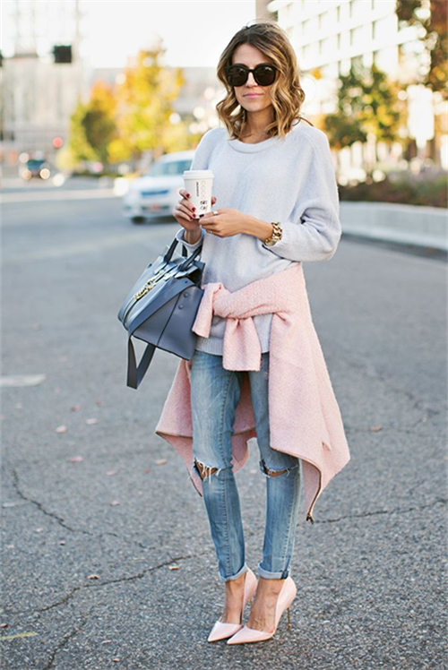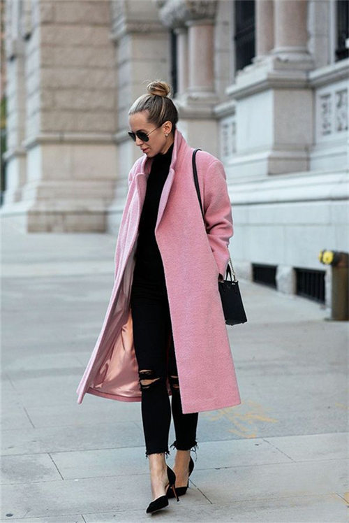 破洞款式的牛仔裤打破拘谨感,搭配粉色粉色呢子大衣甜美不失帅气。