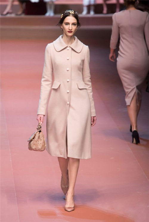 Dolce&Gabbana秀场时装秀场上的浅粉色呢子大衣裸腿穿丝绒材质尖头鞋优雅婉约。