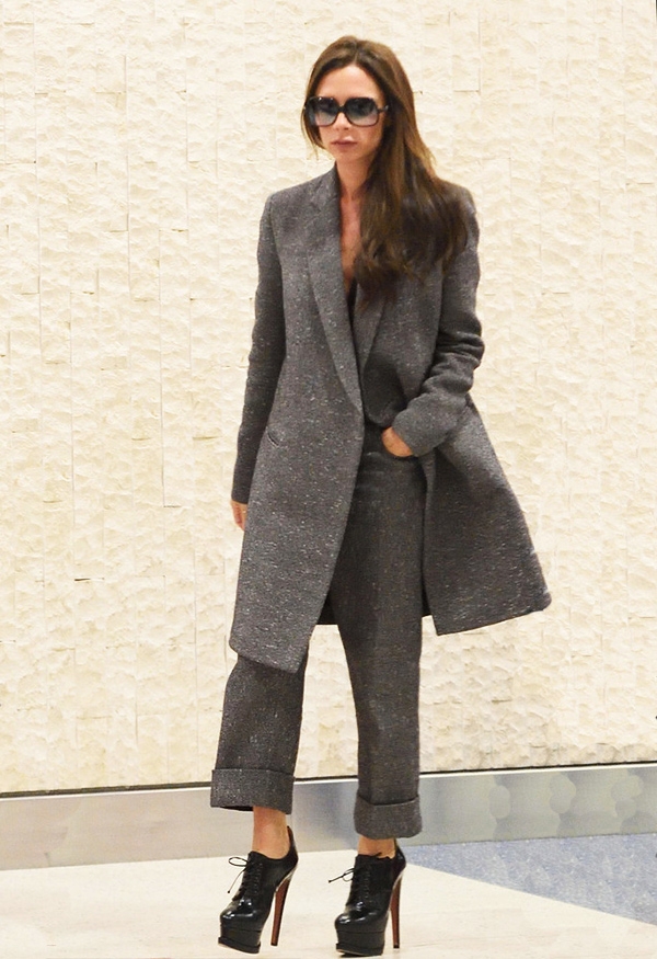 贝嫂用一套深灰的套装加上恨天高简单却又干净利落。