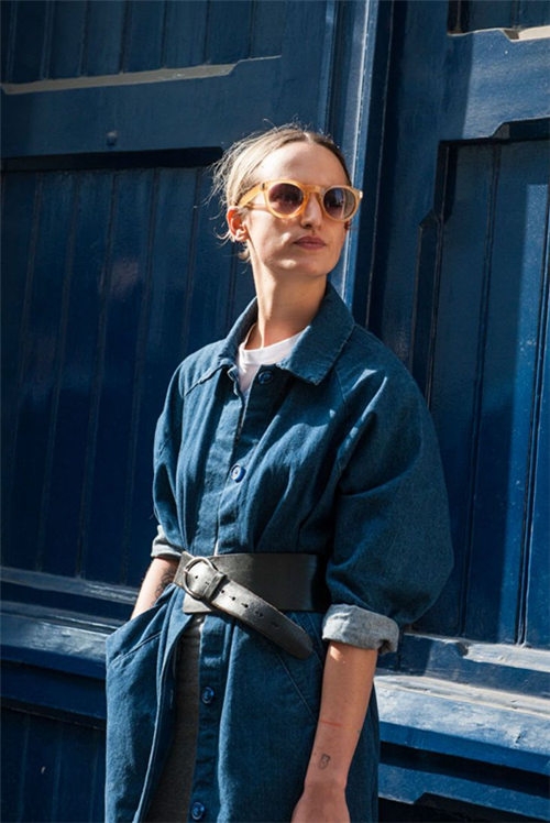 Look2:牛仔大衣外套+白色上衣+高腰裤+款腰带+太阳镜