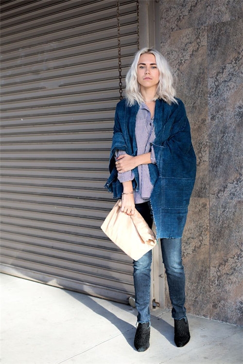 编编觉得这套装扮头发颜色很给力,与牛仔大衣外套形成非常清新的深浅对比,又与手包相呼应,造型十分整体。牛仔大衣外套内搭的束条纹衬衫也是同色搭配十分融洽。