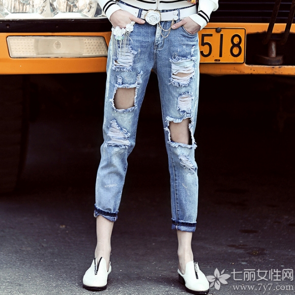 别针卷裤脚法比较有技巧性,非常适合牛仔裤,因为能起到瘦腿收身作用。