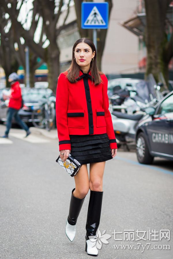 红色短款外套配上黑白拼色长筒靴,整洁而干练,满是时髦格调。精致新颖的小型箱包,又将摩登气息渲染到极致。