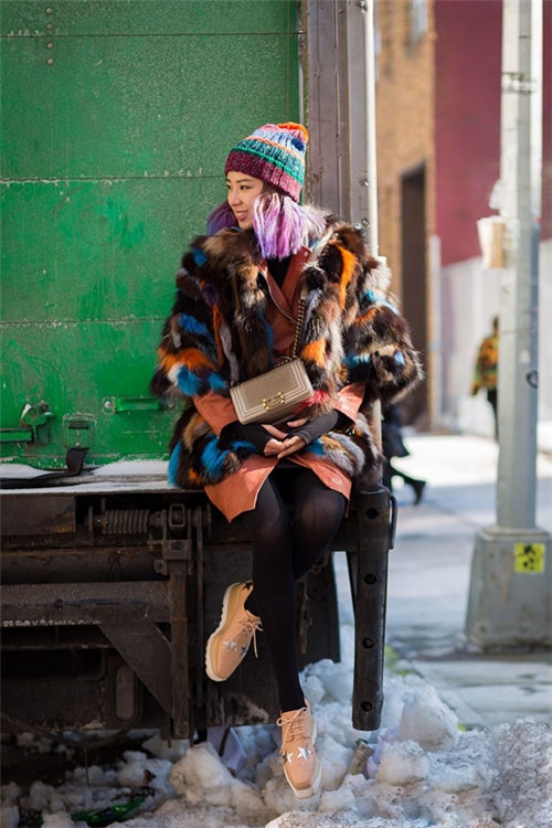何穗最新街拍,灰色毛衣+墨绿色光泽感半裙,文艺慵懒,少女感十足。马海毛毛衣来自H&M,手提包和粉色毛拖鞋均来自Gucci,半裙来自Tibi 2016