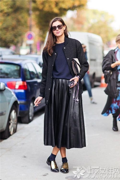 短款上衣除了机车夹克还有实用时髦的棒球服外套,尤其适合小个子的女生搭配百褶裙哦!