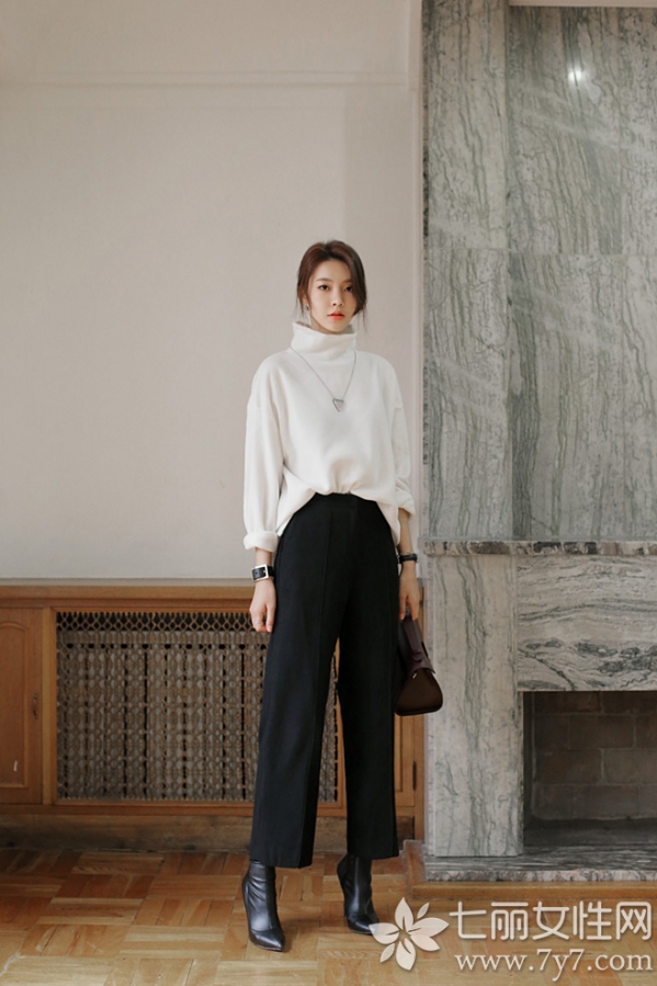 不要小看高领毛衣造型的能力,高级感往往就是这样搭出来的,纯色的高领毛衣百搭耐看,与不同裤子组合,始终保持低调大方。图中搭配裤腿休闲裤的摩登style,无论是工作中还是出街,都会让你独具魅力哦!