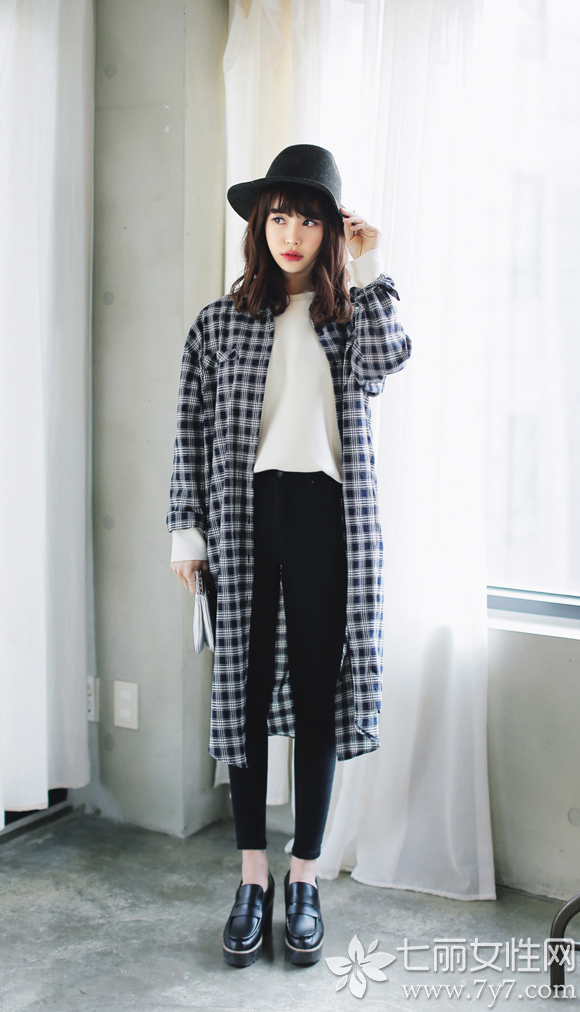 对于铅笔休闲裤,选择宽松一点的上衣更能突显腿部的纤细感。图中韩版长格子衫搭配铅笔休闲裤,绝对是青春无限的组合哦!
