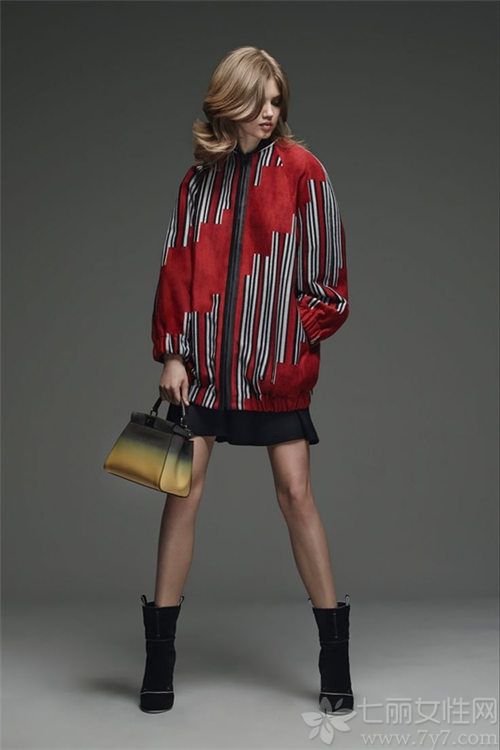 Fendi的大片的长款图案棒球服外套搭配黑色短裙,宽大的长款棒球服十分中性搭配褶裙后带来活泼气氛,长短的结合打造好比例。