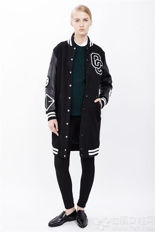 最基本常见的黑色长款棒球服内搭薄款针织衫带来双中温暖,小皮鞋的搭配透露出文艺的学院派风格。