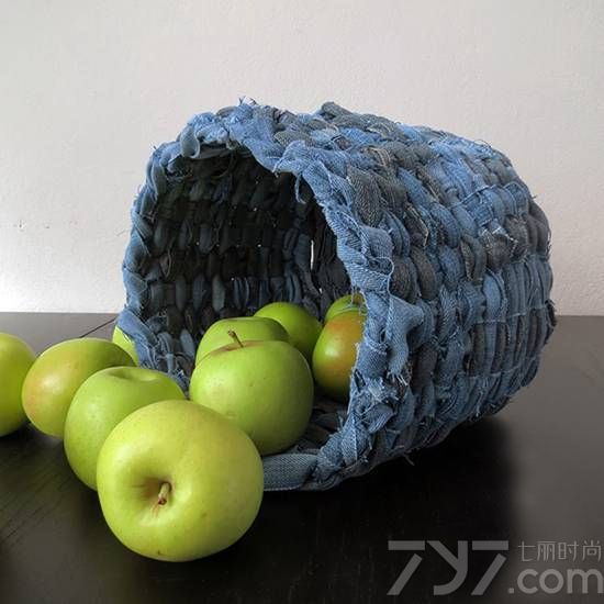 5、编织成想要的大小后,最后的收尾牛仔布条,如果过长,就剪掉部分,其余部分可用胶水粘住蓝内壁,也可缝制在篮壁,这样牛仔裤改水果篮子的DIY就完成了哦!。