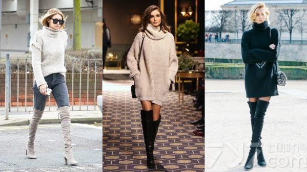 长至大腿的过膝靴在视觉上有效拉长腿部线条,让双腿看上去更加纤长,搭配宽大柔软的高领毛衣,散发迷人慵懒气质!