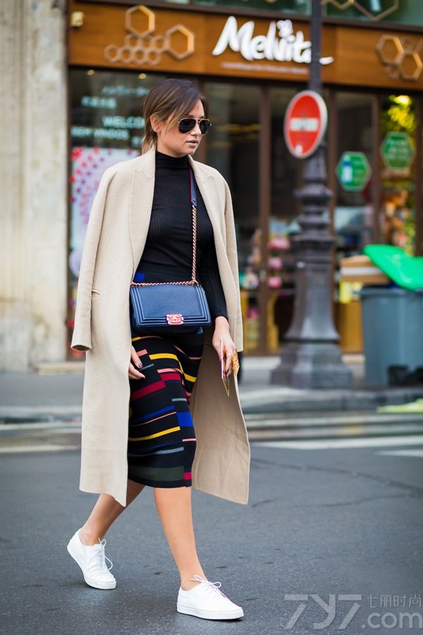 大衣配裙子的造型是女生冬季的最爱,不过女生常有的做法是配上一双高跟鞋,做个高冷女子。不如搭配白球鞋,来一场纯真蜕变,偶尔解放一下少女心和真性情,会有意外收获哦!