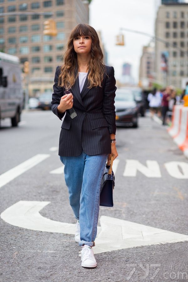 白球鞋与牛仔裤可算是一对好cp,至于裤型选择,无论是破洞,直筒都能招架得住。搭配小西装的上班族style照样让你美得有活力!