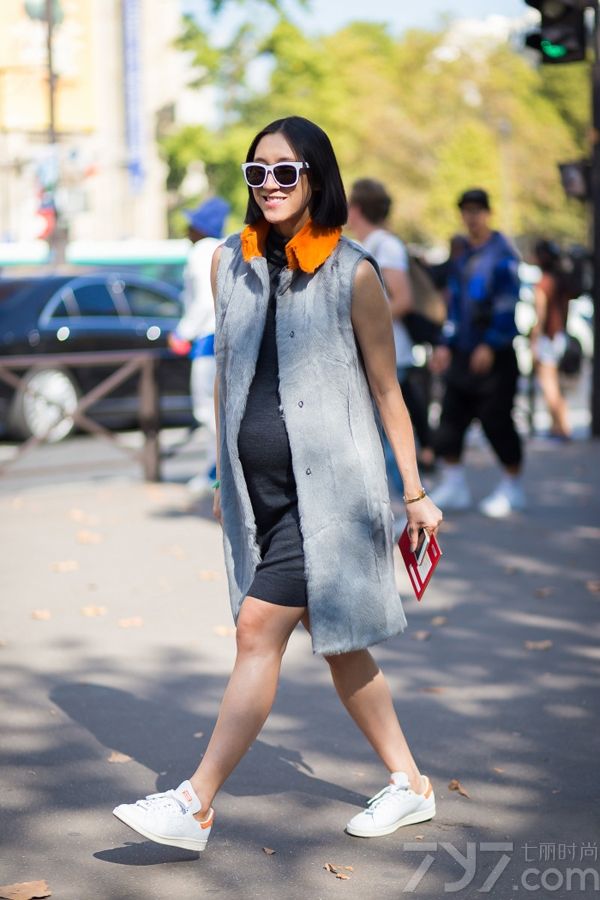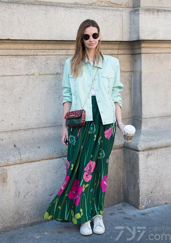 何穗最新街拍,灰色毛衣+墨绿色光泽感半裙,文艺慵懒,少女感十足。马海毛毛衣来自H&M,手提包和粉色毛拖鞋均来自Gucci,半裙来自Tibi 2016