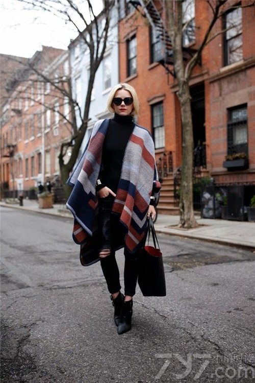 斗篷的款式一般都比较丰富俏丽,黑色高领打底衫做内搭非常合适。