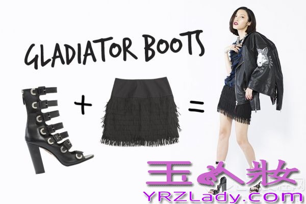 以迷你流苏短靴搭配罗马战士短靴令腿部更加修长。