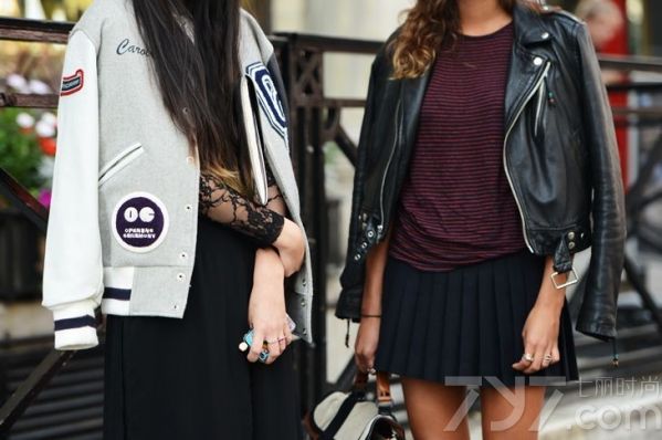 搭配看点:灰色棒球服外套简单搭配一条小黑裙简约而不简单,外套本身具有设计感,在黑色连衣裙的陪衬下格外有气质。铆钉元素的懒人鞋与链条包的铆钉装饰元素相呼应,看上去非常整体。