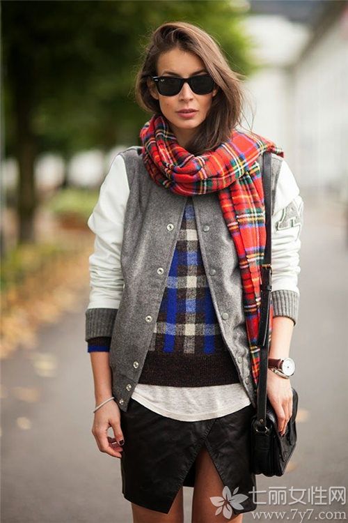 Look2:灰色棒球服+格纹针织+白T+皮短裙+围巾