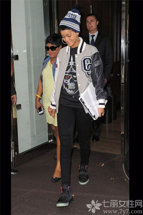 Look3:灰色棒球外套+(黑色T恤+黑色铅笔裤)+运动鞋+针织帽