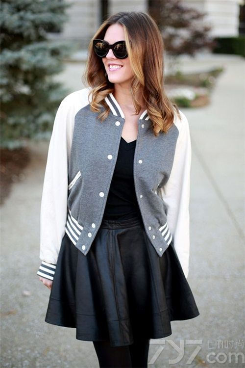 搭配看点:灰色棒球服内搭V字领上衣有效制造透气感,搭配伞裙俏丽,皮质的伞裙质感得到提升,伞裙比较适合臀部娇小的女生哦!