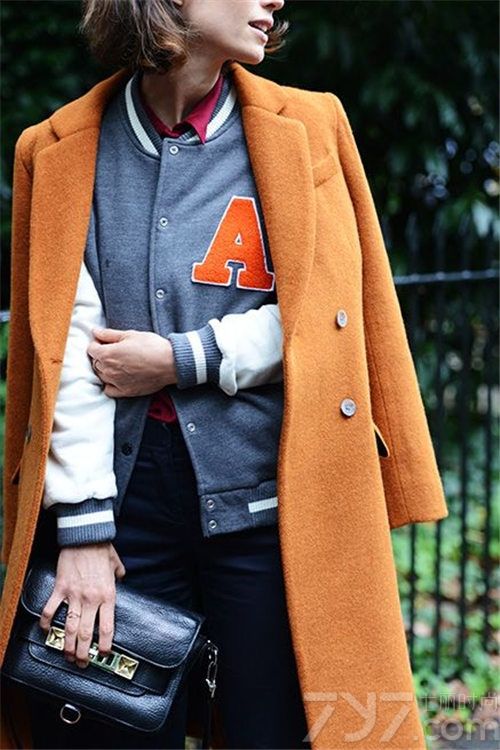 搭配看点:棒球外套除了做内搭,在冬季装扮里同样可以做时髦保暖内搭,这套装扮的心机就在于橙色字母A与橙色大衣“点与面”的呼应,如果单看这件橙色大衣并不好穿。