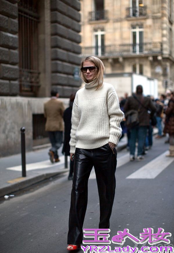想要把针织毛衣搭得既显瘦又个性时髦,那一条皮裤单品就是必备。皮裤的光亮感在与毛衣的粗纹理形成反差,会事半功倍的提高整体时尚度。
