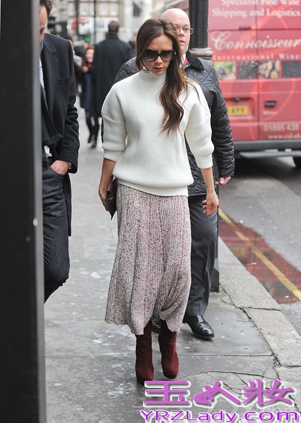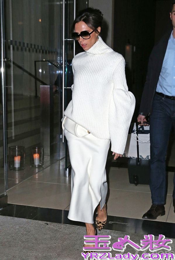 裙装是冬季舞台的主要单品之一,当然偶尔也来凹凹造型!不得不说贝嫂除了人美,衣品也非常好,利用白色毛衣与灰色针织裙的低调色彩,突显整体高级感的LOOK,将优雅时髦展现得颇为大方。