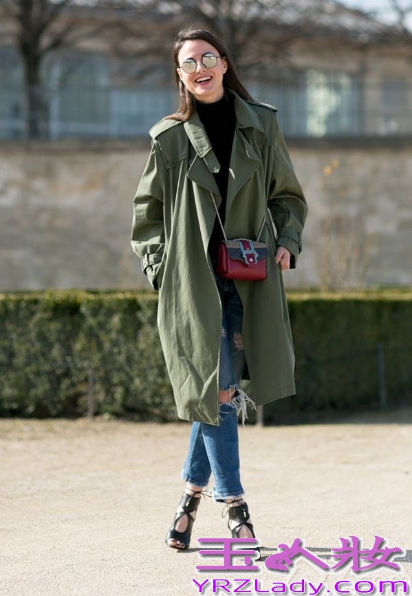 一件基本款的黑色针织毛衣组合上军绿大衣显得年轻有活力,而破洞牛仔裤的加入更增添了几分趣味和个性。