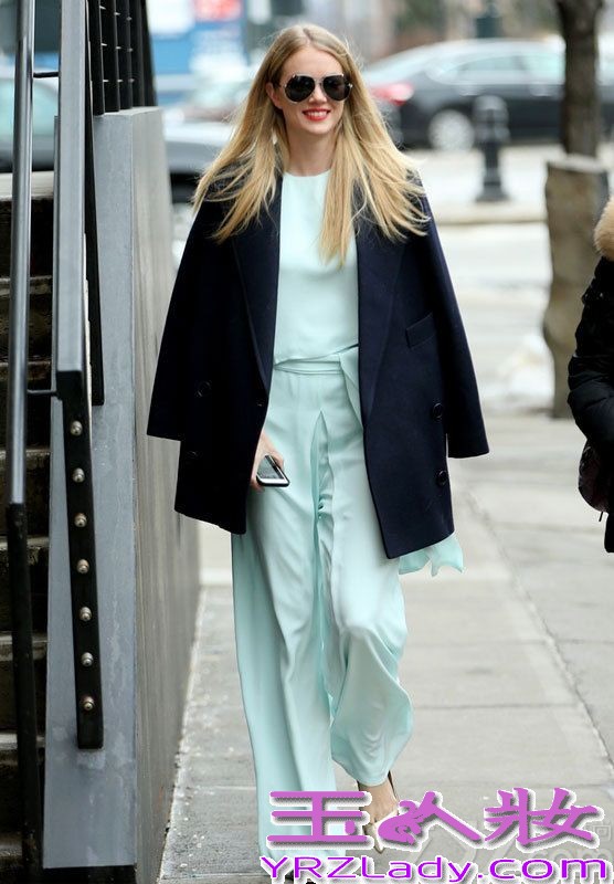 清爽舒适的水蓝色阔腿裤搭配剪裁流畅的西装外套,将气场把握在手中,而银色的尖头鞋款则提高整体的逼格,高级感增加了好几分。