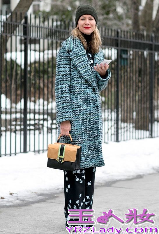 若嫌简约范比较单调,除了配饰点睛外,也可挑选亮色的大衣款式。图中的几何元素大衣在去年街拍中非常常见,新颖百变的拼色设计,不需要其它单品的过多修饰,身披大衣就能时髦出街。