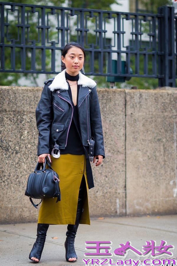 加入柔软毛领的皮衣,看起来更温暖沉稳,但帅气的感觉依旧不减,搭配复古风下开叉麂皮裙,别样的个性气质油然而生,不失为吸睛的选择;最后不忘用皮质包包呼应整体,达到视觉上的和谐效果。
