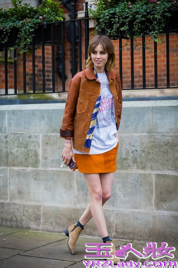 麂皮单品的组合充斥着浓浓的复古意味,走在街上绝对的眼前一亮,而下装选择露出大长腿,丝毫没有穿出工装的感觉;脖颈处不忘配上彩色丝巾,丰富整体色调,增加了几分时尚趣味。
