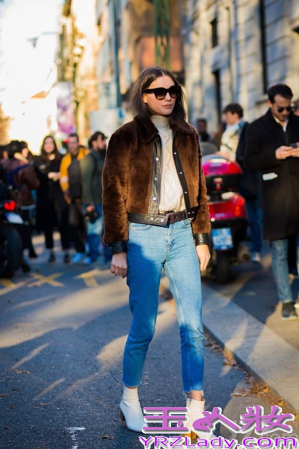 羊绒夹克也是冬季受欢迎的单品之一,颜色低调大方,面料柔软舒适,突显着复古奢华。图中羊绒夹克刚齐腰的长度与牛仔九分裤配合着拉伸腿长,而裤脚与短靴的长度配合也刚刚好,显得整体干练,率性难敌。