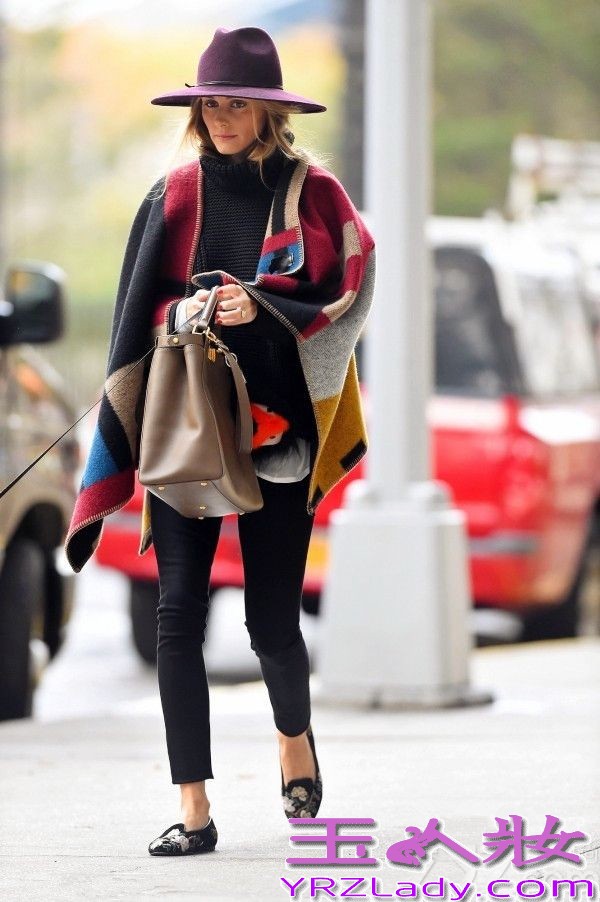 披肩作为时髦达人最爱的抢镜单品,搭配高领毛衣很有贵妇范儿,配上与毛衣同色的小脚裤和平底鞋,在视觉上拉长腿部线条又显得十分干练。