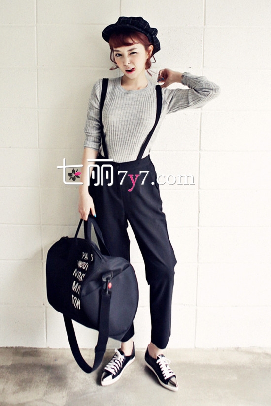 搭配看点:黑色背带西裤时髦又吸睛,两根细细的肩带既可以放下也可以只放下一边,这样更加俏皮。搭配灰色针织打底衫,保暖又清新,搭配黑色休闲鞋街头范十足。