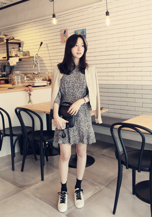 LOOK 3:短款针织开衫+印花连衣裙+球鞋