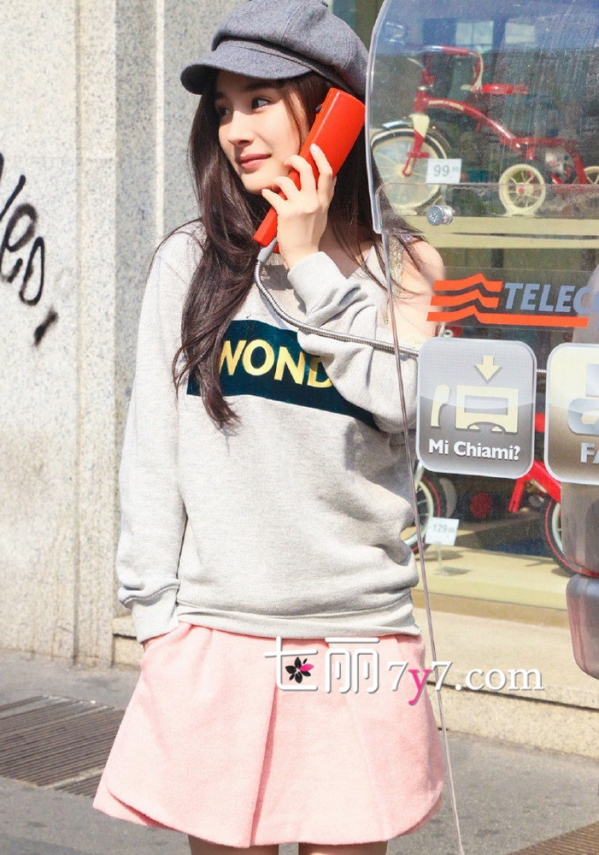 活泼休闲的露肩卫衣、粉色A字裙、再加上一顶灰色鸭舌帽,杨幂从头到脚的每个毛孔都散发出一股美少女般的青春活力。