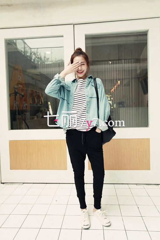 搭配看点:清新的浅蓝色衬衣搭配极具文艺气质的条纹T,将学院风进行到底。下搭黑色哈伦裤和白色帆布鞋,色彩上与条纹T呼应,视觉上更加和谐具有美感,同时让造型更有街头范儿。黑色双肩包与裤装颜色呼应,让造型更加丰富。整体搭配非常休闲清新,适合学生MM上课或出街装扮,舒适又美腻。将头发扎成丸子头,化个淡妆,不要太美哦。