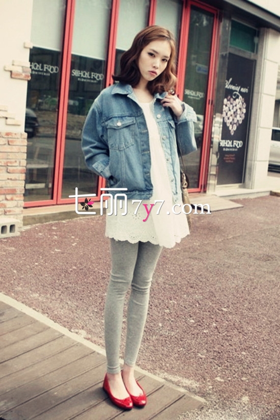 LOOK 3:牛仔外套+白色棉质中长上衣+灰色打底裤+红色平底鞋