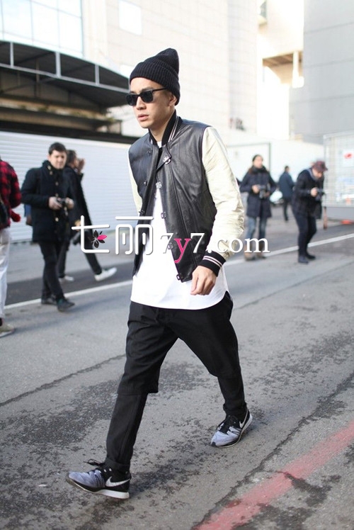 搭配看点:这款黑白色拼接棒球服不仅时尚简约,还非常帅气百搭。经典的黑白色与任何色彩搭配都毫无违和感,不过继续选择无彩色白T和黑色裤装,更显摩登型男范儿。运动鞋也是时下潮流单品,墨镜和奶嘴帽让造型时尚指数直线上升。