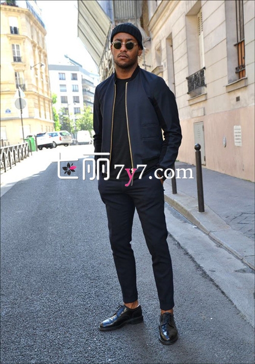 搭配看点:整套的黑色搭配很有007特工的feel,整套造型的关键是选择不同面料的黑色单品。小脚西裤露出脚踝是关键,不然很容易显得boring和拖沓。时尚利器墨镜、牛津鞋和奶嘴帽绝对是装逼必备单品。