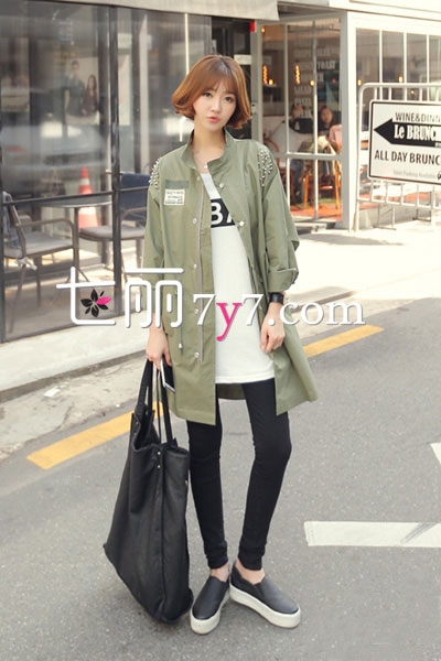 搭配看点:经典的军绿色风衣外套,休闲中带些帅气,韩式的Style,是哈韩女孩们都不能错过的,内穿白色T,下身穿黑色紧身裤,配上乐福鞋,简单利落又好看,随性又帅气时髦。