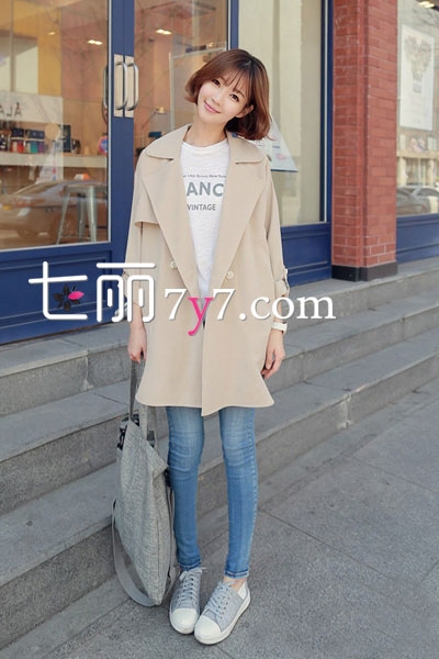 搭配看点:卡其色风衣外套,是一款怎么穿都好看的服饰,不过这款比较休闲随性,韩系风的翻领设计时尚有型,内穿白色T,下身配紧身裤,整个装扮看起来就让人觉得大方舒适。